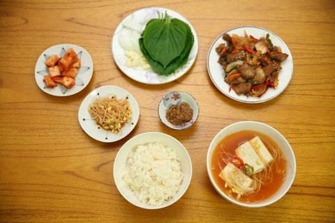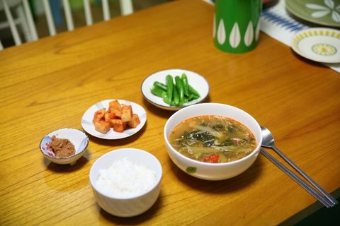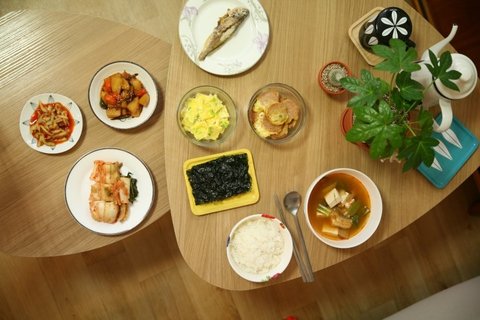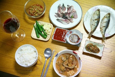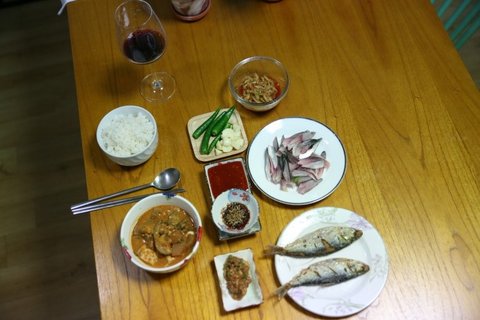 햄/계란반찬 , 감자조림 , 오이무침 , 굴비구이 , 배추김치(제가 담은거) , 갈치국