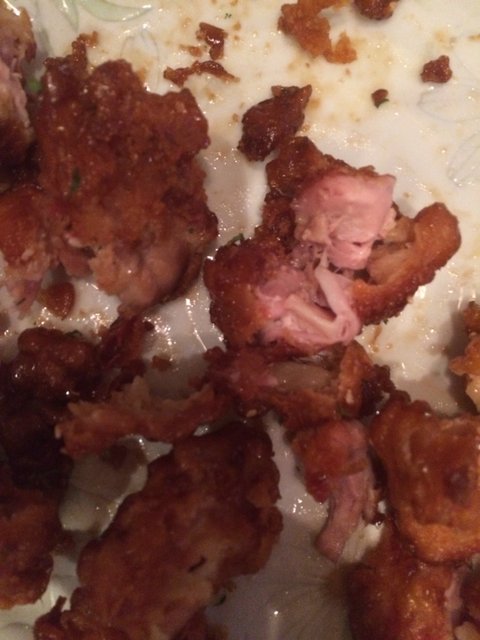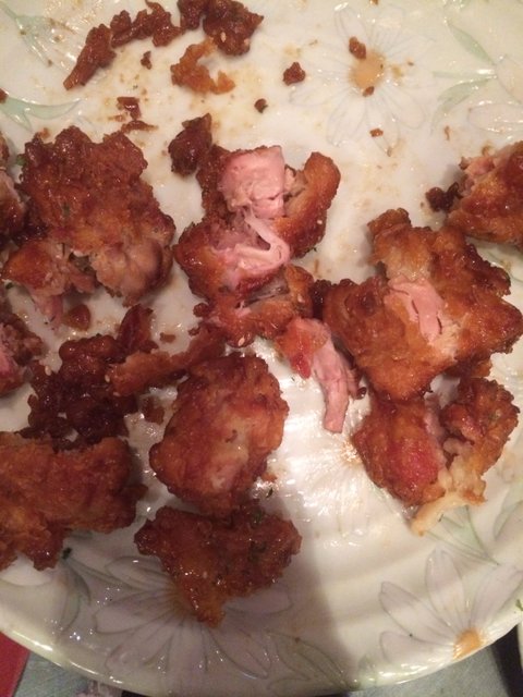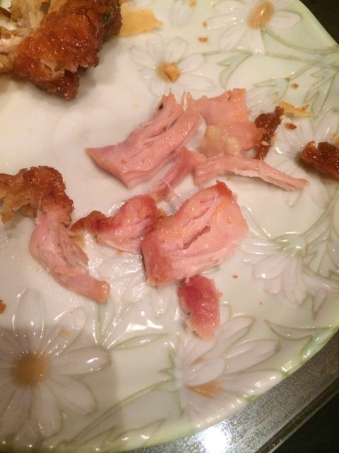근데 먹다가 뭔가 이상해서 치킨속살을 보니까 좀 핑크핑크한 색이 돌더라구요 그래서 이치킨만 그런가하고 남은치킨을 해부하면서 보니까 다 핑크색이 돌더 라구요. 그래서 종업원에게말하니까 사장님을 불러주더라구요.사장님께 이거 치킨 안익은거 같은데 하면서 말햇더니 치킨의 헤모글로빈이 어쩌고 하면서 논리정연하게 말을하더라구요 쉽게얘기하자면 치킨살에 피물이 배겨서 색이 물든거라고..의아하고 의심이 가서 여러분께 문의해요 사진봐주시고 판단좀 해주세요 ㅠㅜ즉석에서 올리는거라 횡설 수설 합니다 ~이해해주세요