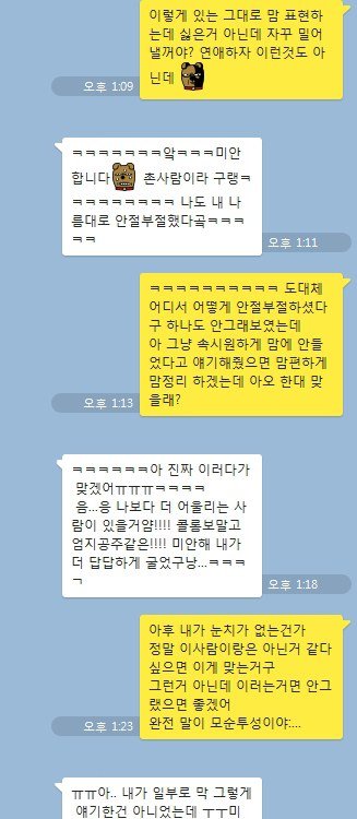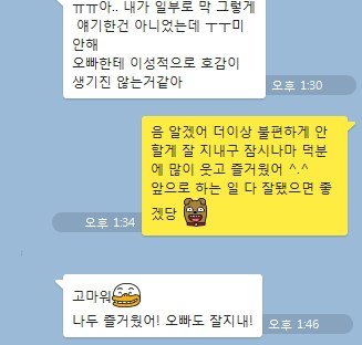 여기서 그녀와 A 그리고 이 둘을 소개시켜줬던 동생은 모두 같은학교 같은과 동기로 서로 알고 있는 사이였고, 그렇기 때문에 연락을 한다는 것부터 정말 많이 미안했죠 압니다. 그래서 누누이 몇차례 나도 잘못인거 알고 이렇게 연락하는거 미안하다는거 아는데 연락을 안해보면 나중에 후회 할 것 같아서 연락을 했다. 그러니 최대한 부담가지 않게 최소한의 연락만 하겠다고 했죠.