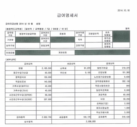 제 급여명세서를 한 번 공개해드리겠습니다.