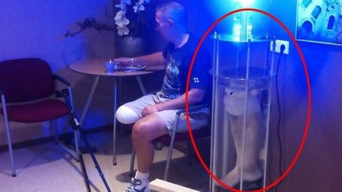 남자는 절단한 다리를 유리통에 넣고 위로 조명을 달아
