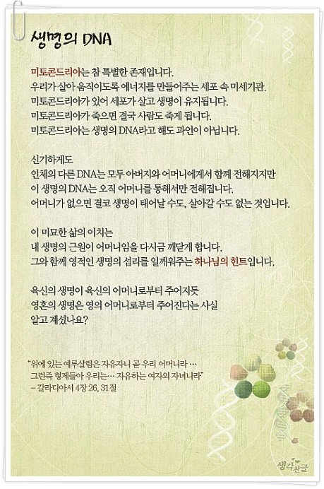 이 생명의 DNA는 오직 어머니를 통해서만 전해집니다.