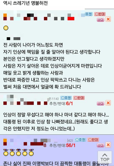 재차 말하지만 오유는 청소년회원이 많습니다.그들이 정치의 문회안이 아닐지도 모르지만 알아봤자 관심있어봤자 얼마나 알겠습니까.그냥 커뮤니티 분위기대로 남들이 다하니깐,그래야만 인기글이 갈수있으니깐 , 그래야만 이들과 동조가 되니깐 이런 마음으로 무작정 욕하는 청소년들 분명이