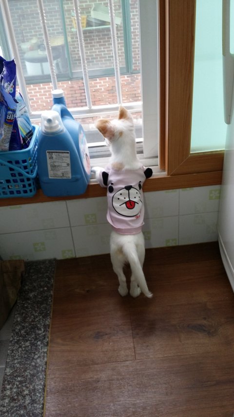 산책가고싶은 콩이... 하염없이 밖만 바라보네요