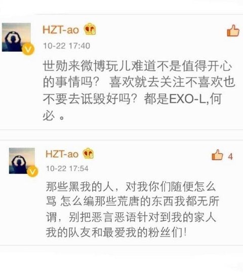 세훈이는 웨이보에 놀러왔어요, 기뻐해야 할 점 아닌가요? (그를) 좋아한다면 팔로우 하세요, 비록 좋아하지 않더라도 (그를) 비방하거나 하지 마세요, 아셨죠? (여러분은 모두) 엑소엘인데, 뭐 하러 그래요.