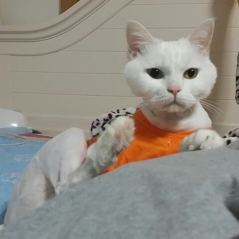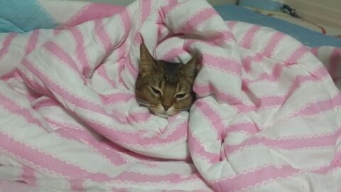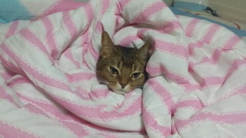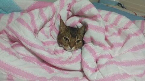 아침에 추운지 이불에 두 앞발 넣고 있길래 이불로 돌돌 말아줬어요-