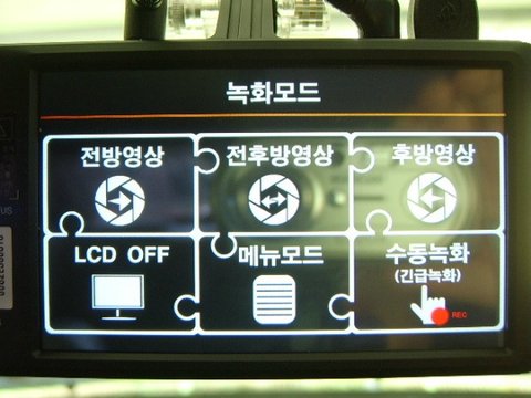 위보드라이브 4인치 LCD화면의 메인메뉴화면으로 실시간영상의 전방영상, 전후방영상, 후방영상의