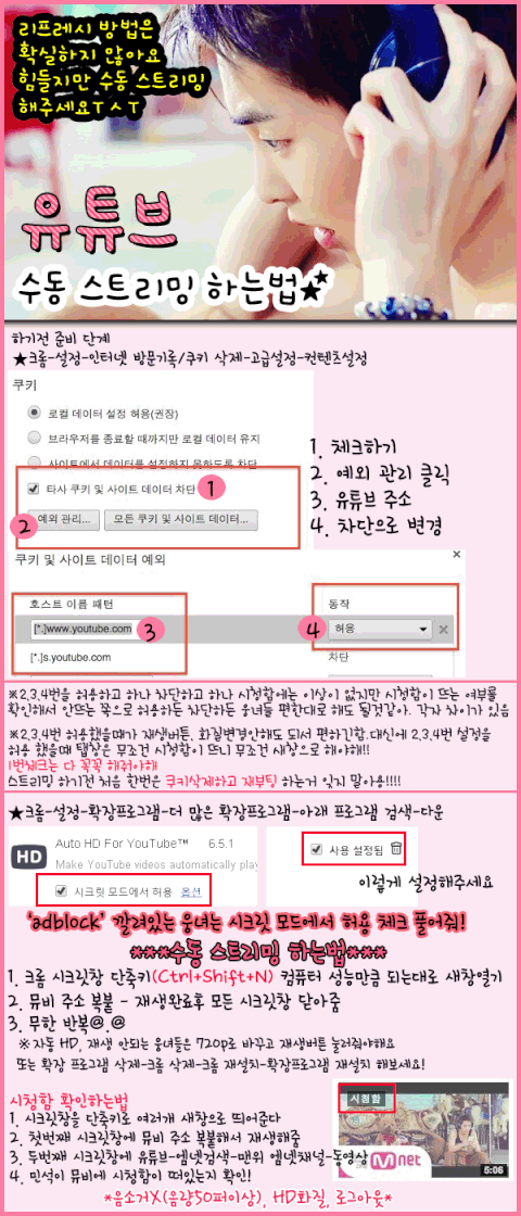 가이드 2,3,4번 차단한뒤로 재생버튼 눌러줘야하고 720p화질 일일이 올려줘야하는웅녀있으면 확장프로그램들 (adblock plus, auto Hd for youtube)지웠다가 다시깔아봐 그리고 콘텐츠설정(크롬의 설정-고급설정-콘테츠설정-)에서 "브라우저를 종료할때까지만 로컬 데이터유지" 체크해 ++ 이렇게 해서 성공한 웅녀들이 많은것 같아 꼭 이렇게 해봐 일일이 재생버튼 누르고 720p 누르지 않아도 되니까 시간절약^^ ++ -확장프로그램 다운받는 링크: