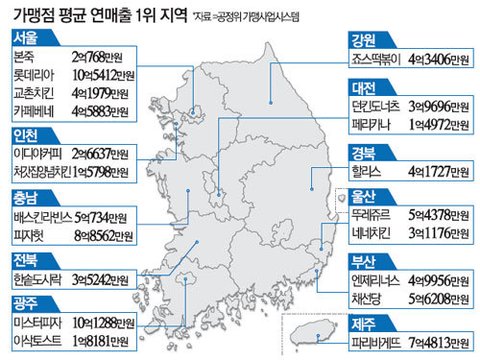 각 지역별 평균 연매출 1위 가맹점들...