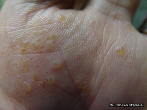 저거 한포진임. 스트레스, 면역저하, 기온차이등으로 생기는건데 스테로이드 연고바르거나 피부과 주사맞음 가라앉음. 터트리면 확번지니 주의!ㅠ