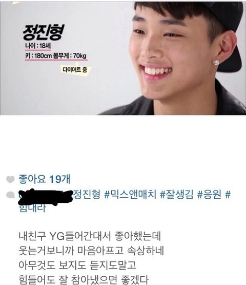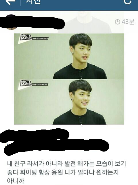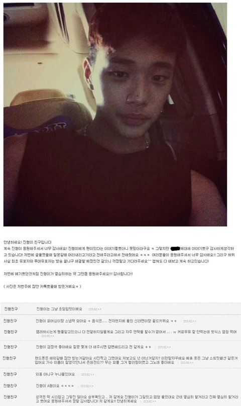 (네이버 블로그에 진형이 친구 만 검색하면 포스팅 2개가 나옵니다. 진형이의 지인이라는건 의심의 여지가 없음. 친구가 인증한 그날 바로 포스팅 - 거기에 더 자세히 정리되있음. 진형이 개인 사진, 진형이 누나 결혼식때 사진 등등 사진 3장 풀고 감. 그리고 현재 진형이 친구가 한 얘기와 진형이의 팬미팅 엔딩멘트 일치. 진형이 가족관계 일치, 진형이 파이널 vcr영상에서 밝혀진 피어싱 모으는 취미 일치 등 위에 있는 모든 진형이에 대한 정보가 일치함.)