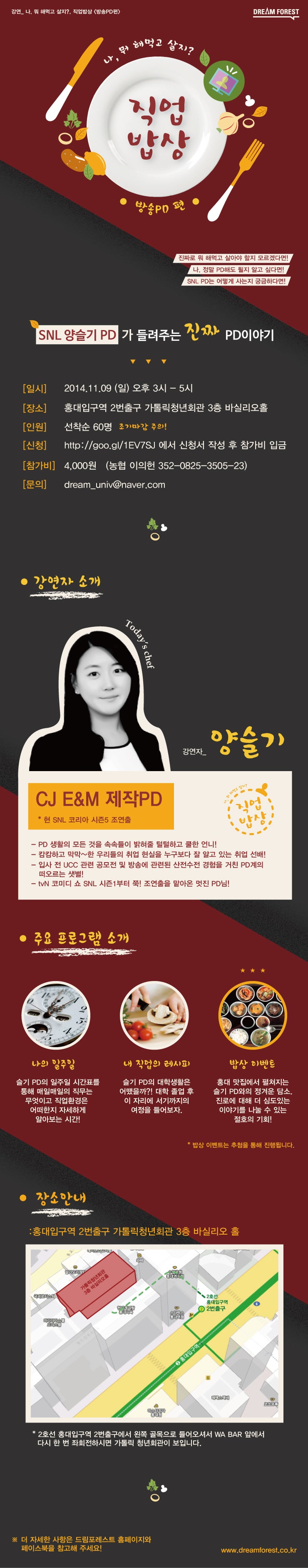 나 뭐 해먹고 살지.. 대학생들 사이에서 참 많이 하는 말인데요! 그만큼 청년 취업의 현실은 막막~하기만 합니다. 이러한 대학생들을 위한 강연이 있어 소개합니다! 바로 대학생강연/문화기획그룹 드림포레스트에서 tvN의 인기 코미디쇼 SNL의 피디 양슬기씨와 함께 준비한 "나, 뭐 해먹고 살지?, 직업밥상 - 방송PD 편"!