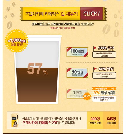 참여방법1. 프렌치카페 카페믹스 컵 채우기 Click!2. 프렌치카페 카페믹스 신규 CF 감상3. CF 속 ‘스틸 컷 순서’를 맞추면 끝~!(중복참여 가능, 1일 1회 한정)
