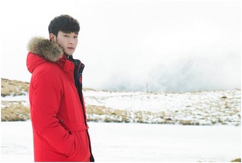 빨간 도브다운 하나 입고 설원에 서 있는