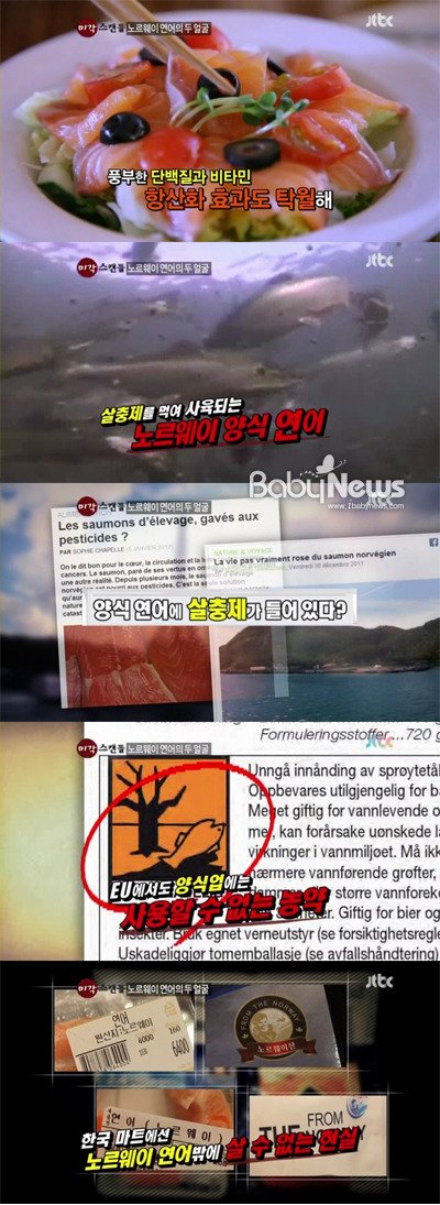 프랑스에서 팔라는 모든 연어를 조사해봤는데, 농도의 차이는 있지만 거의 모든 연어에서 농약이 검출됐다. 농약 외에도 PCB(폴리클로로비페닐) 등의 화학물질이 검출된다. 유럽의 양식연어 공급의 제1위인 노르웨이의 연어가 이 방송이 나간 다음 날, 생선가게에서 팔리지 않았다. 이걸 사는 사람은 전날 TV를 안 본거다.