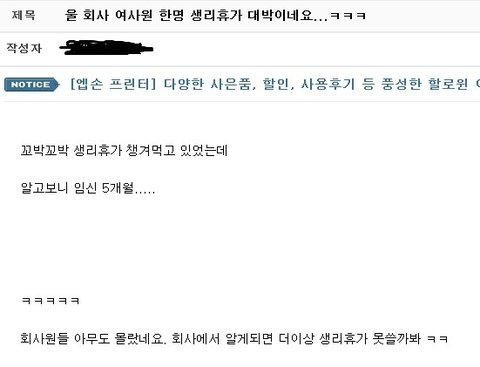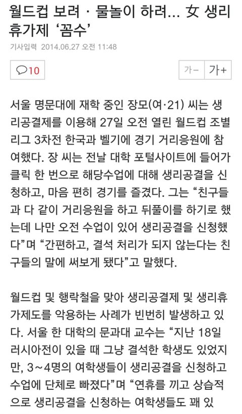월경전 증후군때문에 생리 3-4일 전부터 예민 우울 감정기복으로 날카로워져 매달 일상생활에 지장을 주고 생리 기간 총 일주일 그중 기본 이틀은 참을 수 없는 생리통을 앓고 뒹굴거리는 나로서는 이 글이 굉장히 화가 난다. 니가 한달에 1/3 가량을 대자연에 시달려봤냐? 하루 찔끔 아프고 끝나는 간단한 절차로 보이냐 이게? 교육을 어디서 쳐받은건지... 그리고 어따대고 여자들이라고 싸잡아 말하냐. 모르면 좀 닥치고 앉아나 있어라 제발. 이딴식으로 글 싸질러서 누군가에겐 반드시 필요한 제도 깎아내리지 말고