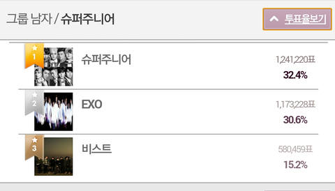 남자그룹은 좀 더열심히 하면 따라 갈꺼 같은데 계속 못따라가고 올해의 가수는 아침에 역전한거긴 하지만 그래도 지금도 조카 불안하다..별로 차이가 안남.....