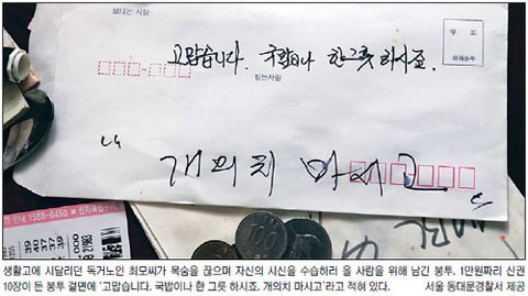 적힌 봉투가 놓여 있었다. 봉투 안에는 빳빳한 신권으로 1만원짜리 10장이 들어 있었다. 경찰은 "자신의 시신을 수습하러 올 사람들을 위해 식사나 하라며 돈을 남긴 것으로 추정된다"고 말했다.