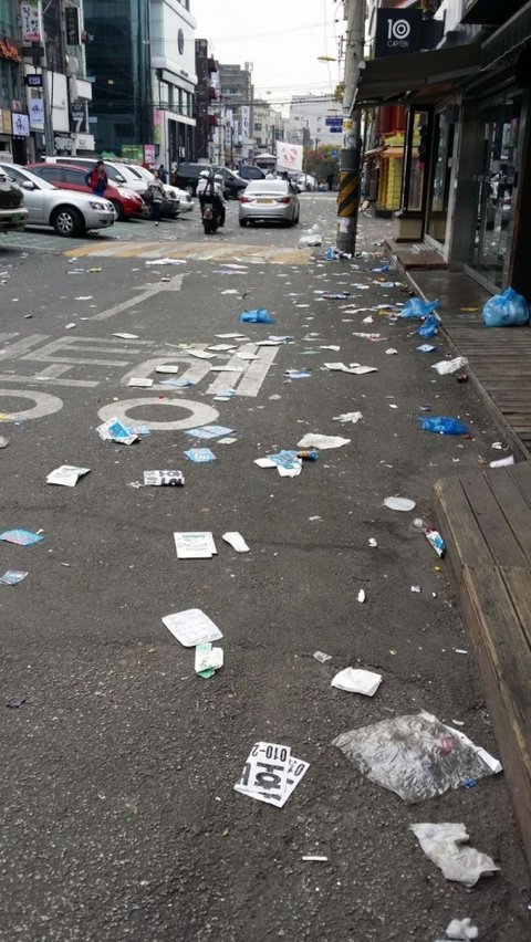 발렌타인데이도 그렇고 무슨무슨데이니 하는 의미없는 양놈들 명절에 왜 한국사람이 설레발인지 모르겠다. 단지 놀 구실이 필요했던건가? 그래도 자기가 논 자리는 자기가 치웠어야지 저리 개판으로 만든 건 아직도 이 나라가 미개하다는 증거 아닐까?