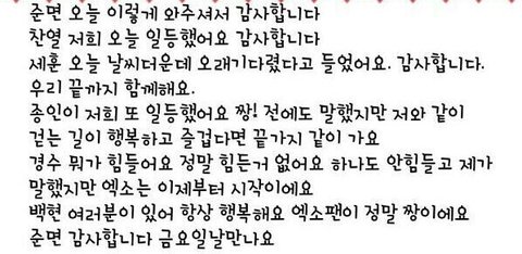 나중에는 저희가 늙어서 춤도 못추고 노래도 잘못하게 될수도 있고 인기가 많이 없어질 수도 있지만 끝까지 엑소로서 잘했으면 좋겠어요.