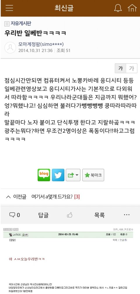 미친ㅋㅋㅋㅋㅋ애들이라 아직 사리분별 못하나본데 초중딩은 일베 차단시켜줘야 된다고본다 아니 애들이 저게 뭔꼴이얔ㅋㅋㅋㅋ에휴