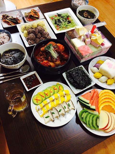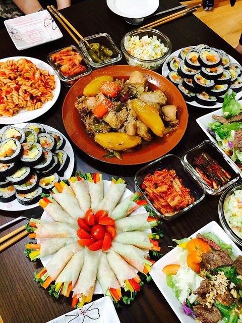 친구들이 놀러와서 처음으로 차려준 밥상이에요.. 우리집김밥이랑 찜닭, 옥수수코울슬로, 푸실리냉파스타, 부채살샐러드, 그리고 집들이에 빠질수없는 무쌈말이..ㅋㅋ 안에는 연어가 쏙!