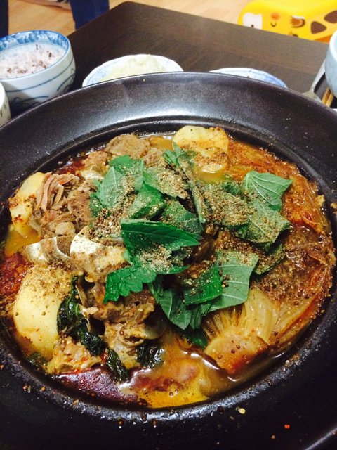 친한친구가 놀러와서 저녁으로 해먹은 묵은지감자탕입니다. 등뼈사다가 반나절 물에담가서 핏물을 제거한다음 한번 끓여서 불순물빼주고 압력솥에 푹 끓여낸다음 된장양념해서 씻은묵은지랑 감자넣고 같이 끓여주면 끝! 마지막에 깻잎이랑 들깨가루 팍팍!! ㅋㅋ