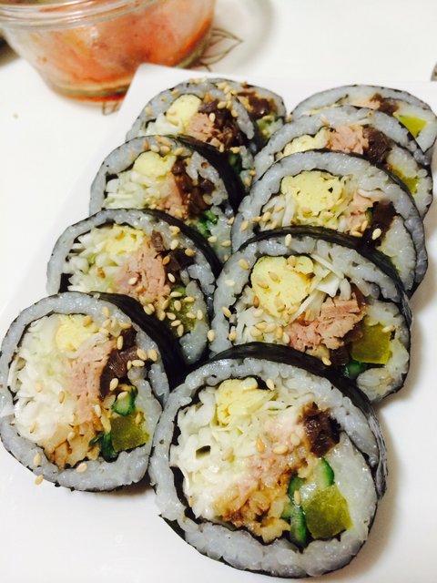 이번에도 어김없이 김밥.. 우리집에 김밥귀신이 있어서..ㅋㅋ 맨날 당근왕창넣고 만든 김밥만 먹다가 요번엔 참치랑 양배추넣고 만든 샐러드김밥입니다. 1탄과 마찬가지로 우리집 김밥 다른점은 계란을 지단을 부쳐가지고 채썰어서 팍팍넣어요!! 모양도 이뿌고 씹는맛도 더 부들부들~~