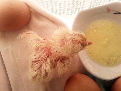 ▲ 알을 깨고 나온 첫 번째 병아리 어미 닭이 아닌 인간의 손을 많이 탔지만, 그래도 건강하게 태어난 첫 번째 병아리