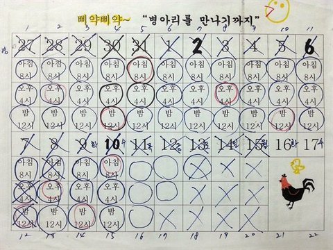 ▲ 병아리 부화 일정표 부화기에 유정란을 넣고 하루하루 체크해 가며 손꼽아 기다린 흔적이 고스란히 남아있습니다.