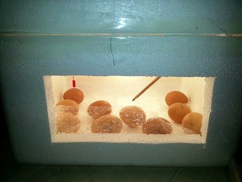 ▲ 모든 준비를 마친 부화기 내부 모습 부화기에 낸 창을 통해 들여다 본 내부 모습입니다. 오른쪽의 쇠막대가 온도감지 센서입니다.