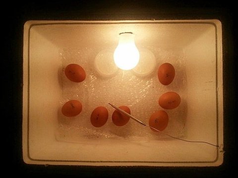 온도 감지 센서는 박스 안쪽 가운데쯤에 떠있도록 했습니다. 자동온도조절기를 전원과 연결했더니 백열전구에 불이 들어와 부화기 안의 온도가 올라가기 시작했습니다. 부화기 내부의 습도를 유지하기 위해 백열전구 아래쪽에 물을 담은 그릇을 넣어 두었습니다.