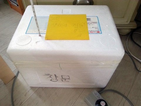 ▲ 위에서 내려다 본 부화기 내부 모습 스티로폼 재질이라 백열등의 높은 온도가 위험할 수도 있습니다.