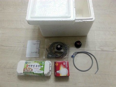 준비물은 스티로폼 상자, 자동온도조절기, 백열등 소켓, 연결선, 백열 전구, 막대 온도계 등입니다. 스티로폼 상자는 택배에 사용된 아이스박스를 재활용했습니다. 자동온도조절기와 백열 소켓, 연결선 등은 인터넷 쇼핑몰에서 '부화기용 온도조절기'를 검색해 구입했습니다. 비용은 1만 8000원 가량이 들었습니다.