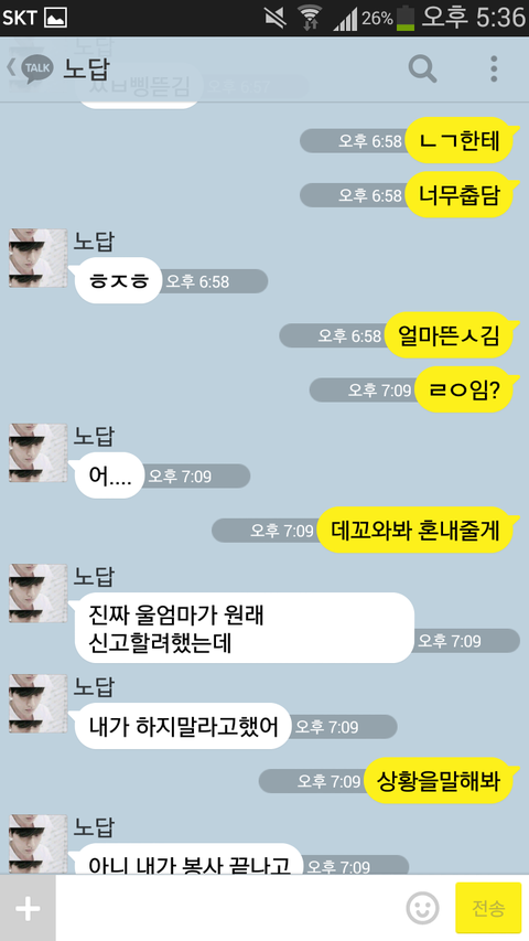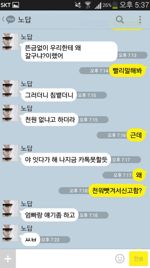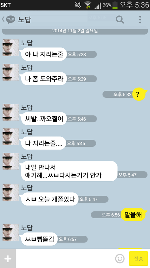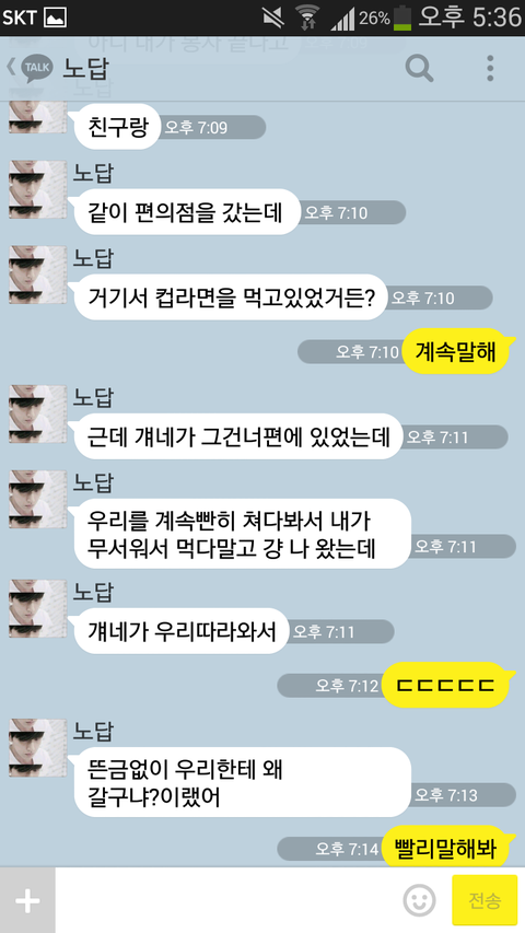 어제어떤일있었냐면 제친구노답이 저에게카톡을보냈습니다. 저에게막도와달라고 무섭다는식이톡이와서 전 걱정을했습니다. 그래서관심있게 들었는데 좀화가나는이야기라서 걱정을했건만..ㅜㅜ