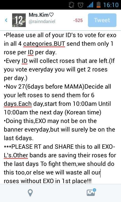그럼 그걸 하루에 하나씩만 엑소에 투표하고 나머지 하나는 아껴두는거야 그리고 11월 27일에 (마마하기 6일전) 한국시간으로 오전 10시부터 그담날 오절 10시까지 남은 장미들을 총공하는거지. 그렇게 하면 마지막 6일동안은 1위할수 있다는거같아. 아마 다른 팬덤들도 다들 장미를 모으고 있나봐!