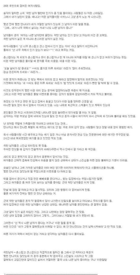 전형적인 된장녀 글이군요......남녀관계는 상대적인 것입니다. 지금 위의 글은 두사람의 만남에 있어 모든 책임을 남자에게 다 지우고 여자는 그저 평가만 하는 그런 못된 여자의 글입니다. 남자가 서툴면 여자가 그 서투름에 대해 어찌 할 지 안다면 알려주어야죠. 알려주지도 않으면서 데이트가 잘못되는 모든 책임을 남자에게 뒤집어 씌우고 자신은 그저 무책임하게 남자탓이나 하며 점수나 먹이는 파렴치한 짓을 하고 있습니다...남자입장에서 볼 때 자신은 아무것도 안하고 모든 부담을 남자에게만 지운 채 남자 등골이나 빼먹으려하는 아주 못된 년이죠.......참고로 알고계시나요? 지금 당신과 같은 짓을 남자도 하는 사람 있습니다...순진한 여자 꼬셔서 따먹고 버리는....