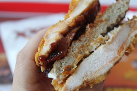 요렇게 소스가 쫀쫀하게 잘 발라진 베이컨도 사이에 들어있어요