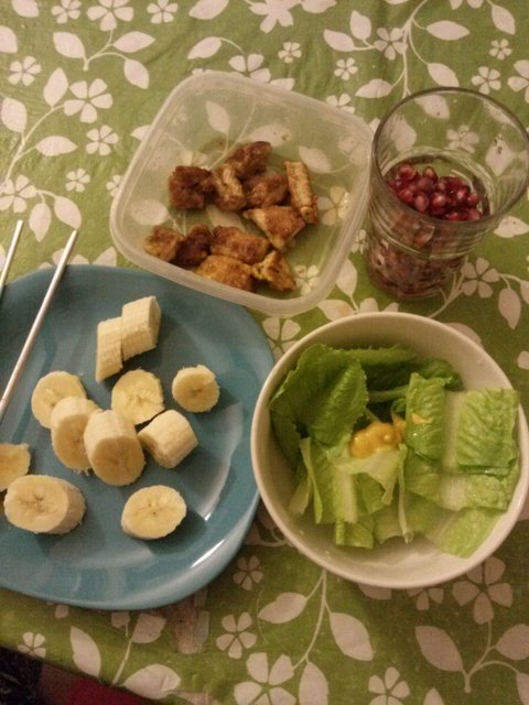석류반쪽 바나나한개 양상추 닭가슴살카레구이(기름안두르고 카레가루 묻혀서 100그램정도 구웠어요)