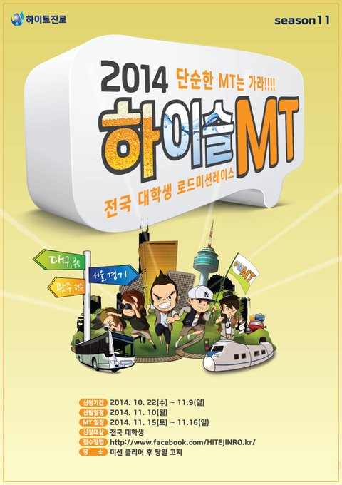 하이트진로 ‘2014 하이슬 MT 시즌11’ 모집이 시작되었답니다~모두다 참여할 수 있는 건 아니구요, 대학생만!!오직 대학생만 참여할 수 있는 대학생 MT인데요~이런 게 대학생의 특권 아니겠어요?