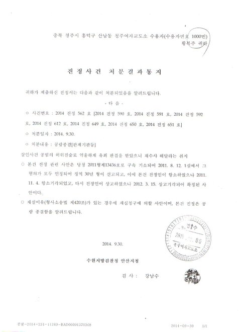 아래 사진은 강남수 검사님이 종결시킨 종결처분통지서입니다.