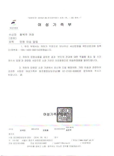 아래의 사진은 여성부장관님과 대통령님께 보낸 서신에 대한 답변입니다.