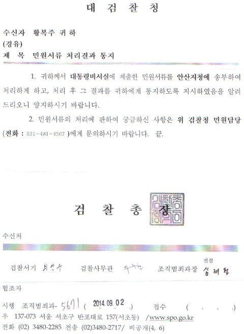 그리고선 배당된 강남수 검사님은 10월 7일 저희엄마가 날조된 현장검증을 찍고 조작해버린 경/검찰을 수사해 달라는 것을 종결시켜버렸습니다.