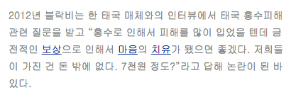태국 홍수에 대해 알고 있느냐는 질문에 지코는 "저 여러분들 홍수로 인해서 마음의 피해나 가족들이 피해를 많이 입었을텐데 저희가 금전적인 보상으로 인해 마음의 치유가 됐으면 좋겠다"고 이야기. 그리고선 "저희가 가진 건 돈 밖에 없거든요 저희들이" 라고 말하는데 박경이 장난인지 "이번에 얼마나 벌었어요?"라고 질문을 하자 지코가 "나 7000? 7천원정도.." 라고 말해 박경은 실소를 터뜨리고 통역사 역시 어이가 없었는지 헛기침을.....