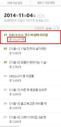 보시다시피 1위의 'EXO-K D.O 경수와 함께 하트를 ' 이란 엑소 디오팬들이 운영중인 저금통에 무려 하루에 콩에 111,177개나 저금이 되었습니다.
