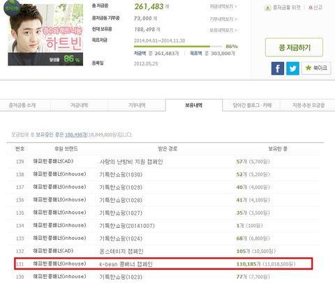 캡쳐와 링크에서 보실 수 있듯이 무려 110,000개가 넘어가는 콩을 k-bean 콩배너 캠페인만을 통해 모은것입니다.