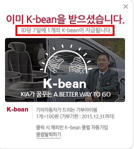 보시다시피 K-bean 캠페인은 아이디당 7일에 1개의 콩만을 지급해주는 콩배너이며 기아자동차에서 후원한 이 캠페인은 불과10월 22일 경에 시작되었습니다.