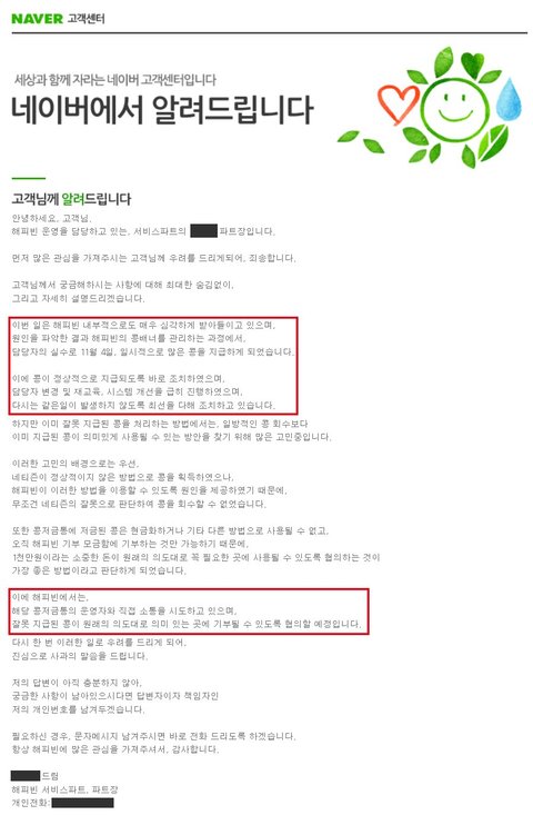 문의글 답변에서 보실 수 있듯이 이번 해피빈 콩 배너 오류 악용 사건으로 네이버 해피빈 측에서는 담당자 변경 및 재교육, 시스템 개선을 진행했다고 합니다. 잘못되고 어긋난 팬심으로 인해 누군가는 원래 맡던 직책에서 물러나게 되고, 담당 부서 내에서는 이 일을 바로잡기 위해 식은땀을 흘리고 있는 것입니다.