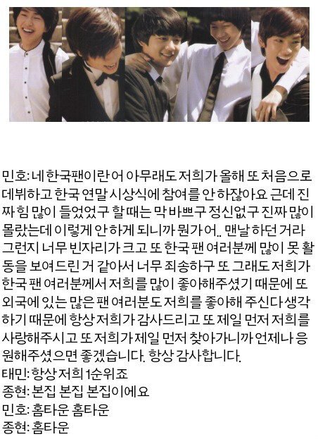 얼마전 일본 히로시마콘서트에서 기범이가 한국에서 오신분들도 있다고 들었다면서 어디계시냐고 물어서 다섯명 다같이 인사도 해주고 아...예전 한국단콘에서 태민이가 "대한민국 팬분들" 감사하다고 했다가 섬녀들한테 욕도 얻어먹었지...ㅋ