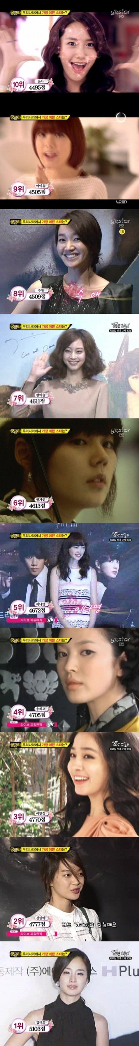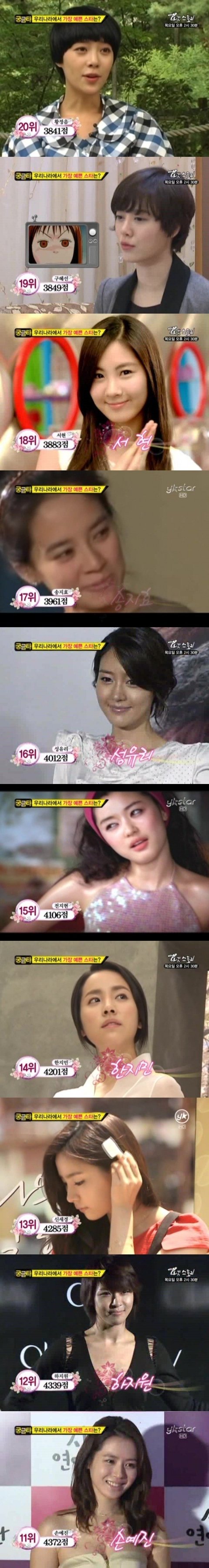 이연희,전지현,한지민,손예진이 아이돌들보다 위로, 좀 더 높은순위로 올라오고 신민아,이나영,이민정이 조금만 내려가고 최상위권에 이영애,김희선 추가되면 더 꽤 객관적인 순위가 될거같지만..